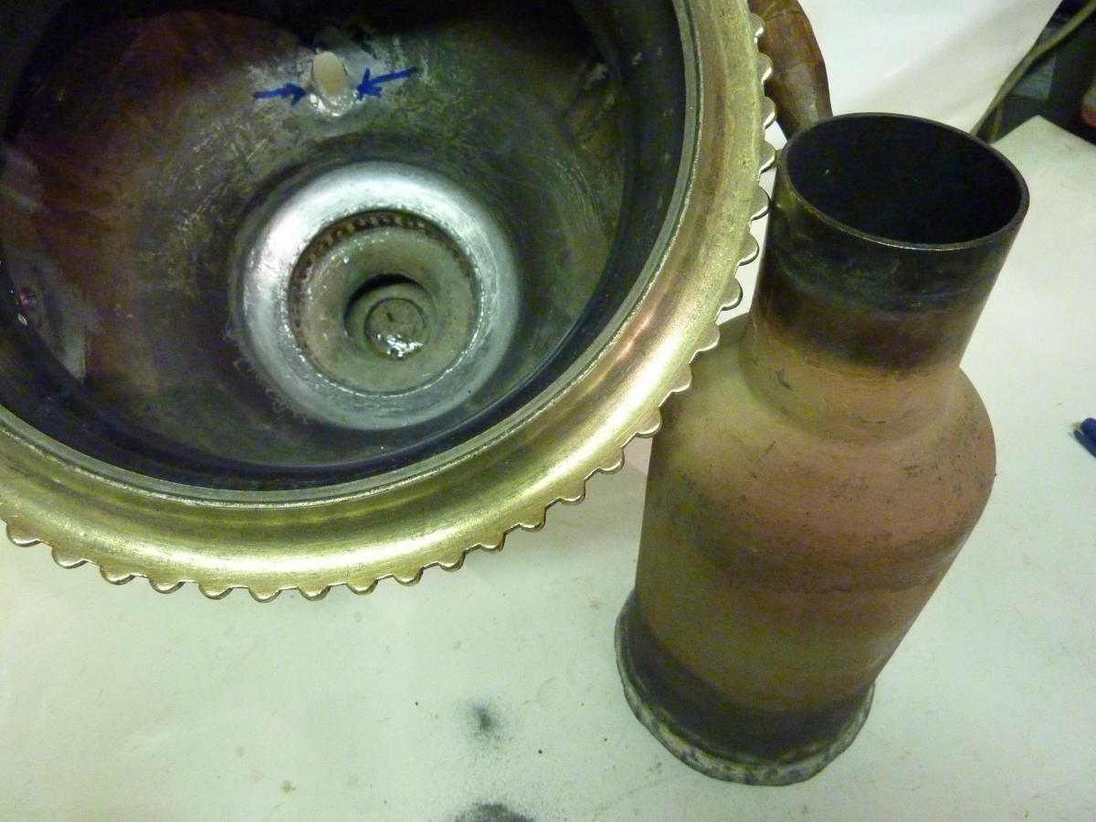 Не спешите выбрасывать самовар из-за прогоревшей или треснувшей трубы - трещину в трубе можно запаять и самовар еще послужит. Для ремонта трубы самовара необходима ее полностью выпаять, затем труба зачищается, проверяется на наличие трещин и если они есть - трещины паяются твердым сплавом. После чего труба запаивается обратно. Длительность ремонта от суток до трех.   пайка трубы самоваравыпайка трубы самовараприпаянная труба самовара